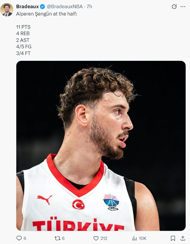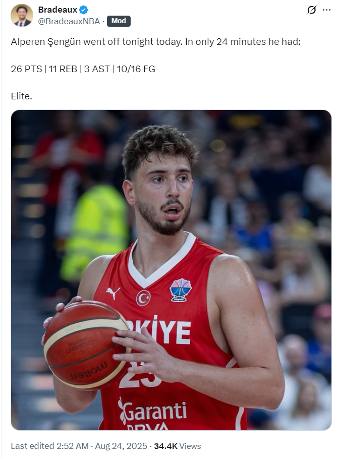 北京时间8月24日,欧锦赛热身赛,土耳其男篮96-85击败黑山男篮,这场比赛土耳其核心阿尔佩伦-申京再度拿到了25+的数据,他在对阵立陶宛、德国、黑山的三场热身赛中都拿到了25+,他无愧是土耳其第一核心。